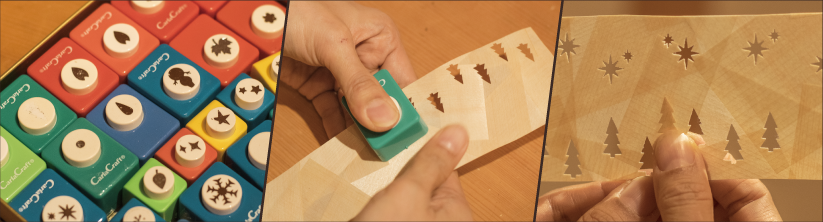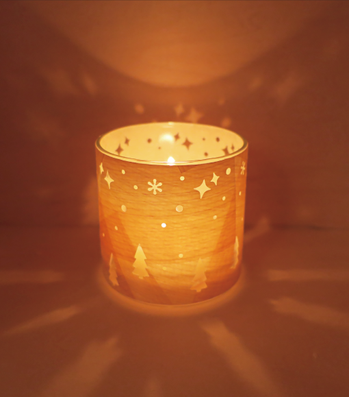 吉野ヒノキと吉野手漉き和紙を合わせたシートに、お好みの模様を型抜きします。LEDキャンドルがセットになっていますが、本物のキャンドルをご使用頂くことも可能です。型抜きした部分からあかりがこぼれ、模様が優しく揺らぎます。